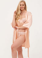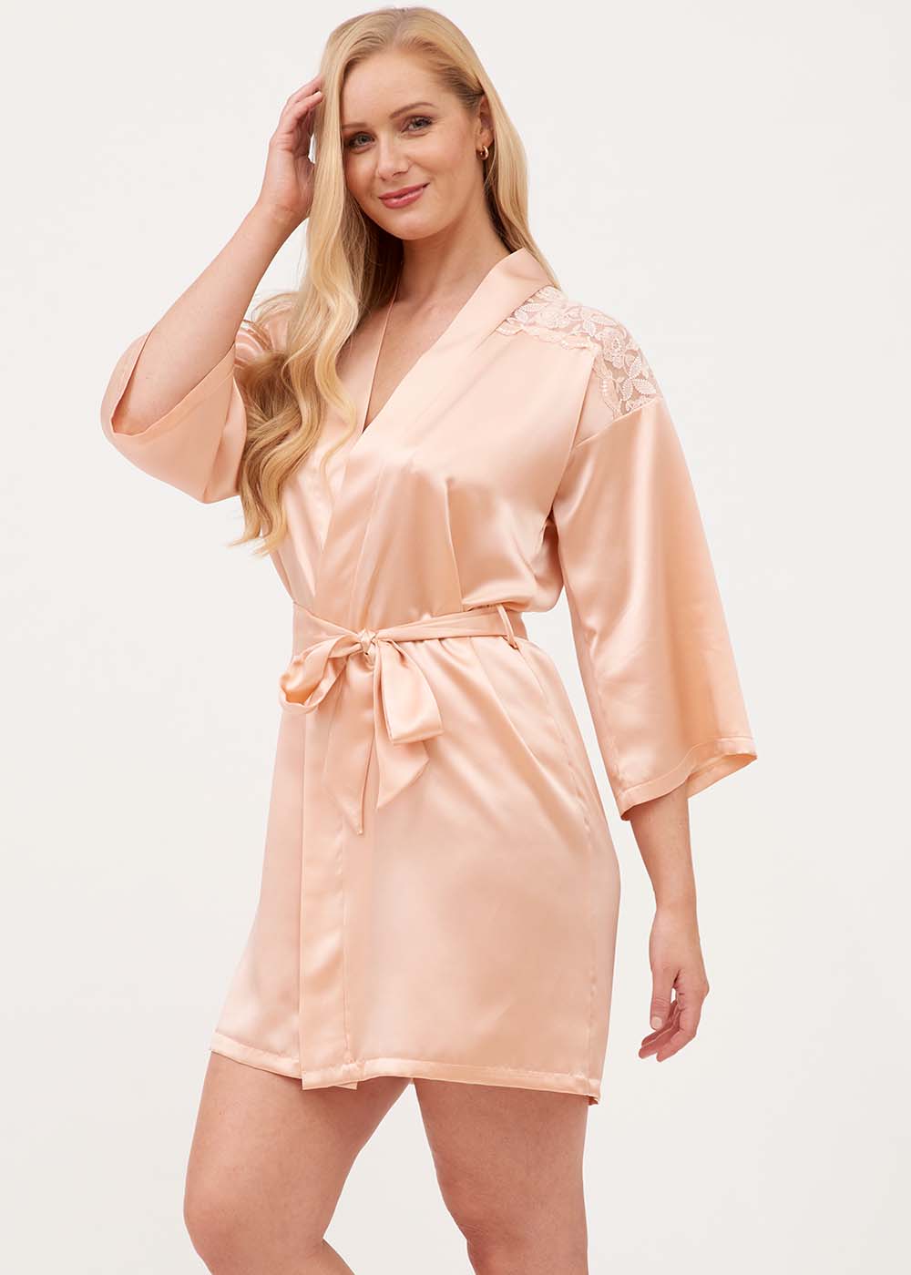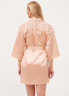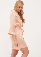 Pure silk short robe with embroidered lace detail across the yoke. Three quarter length sleeves and inner silk ties. Length approximately 35”/90cm from nape.