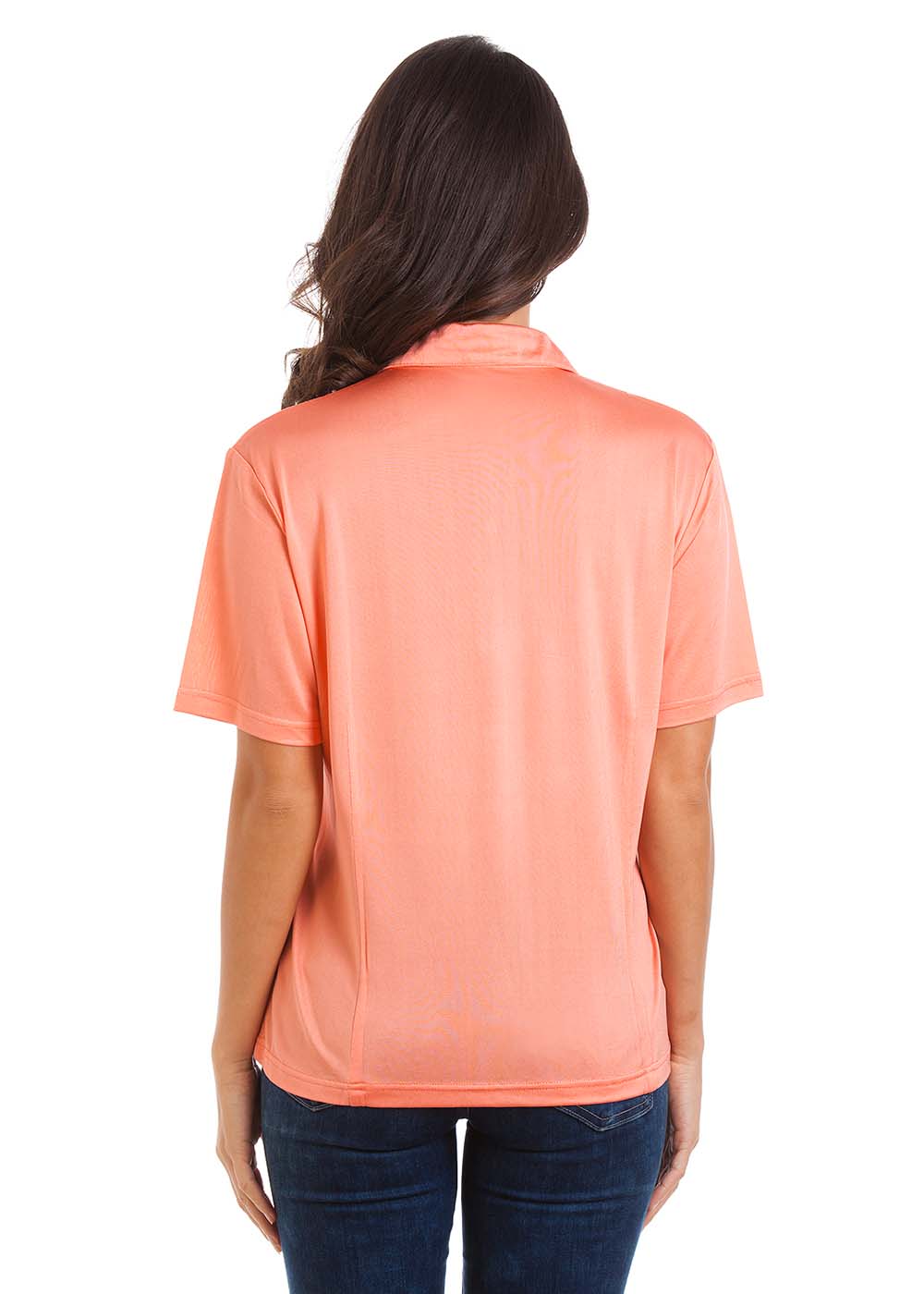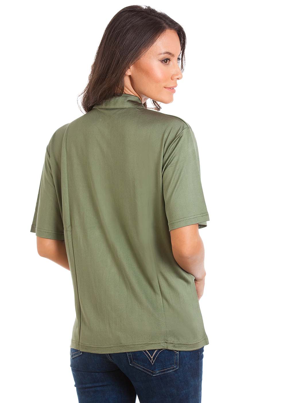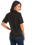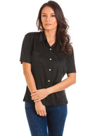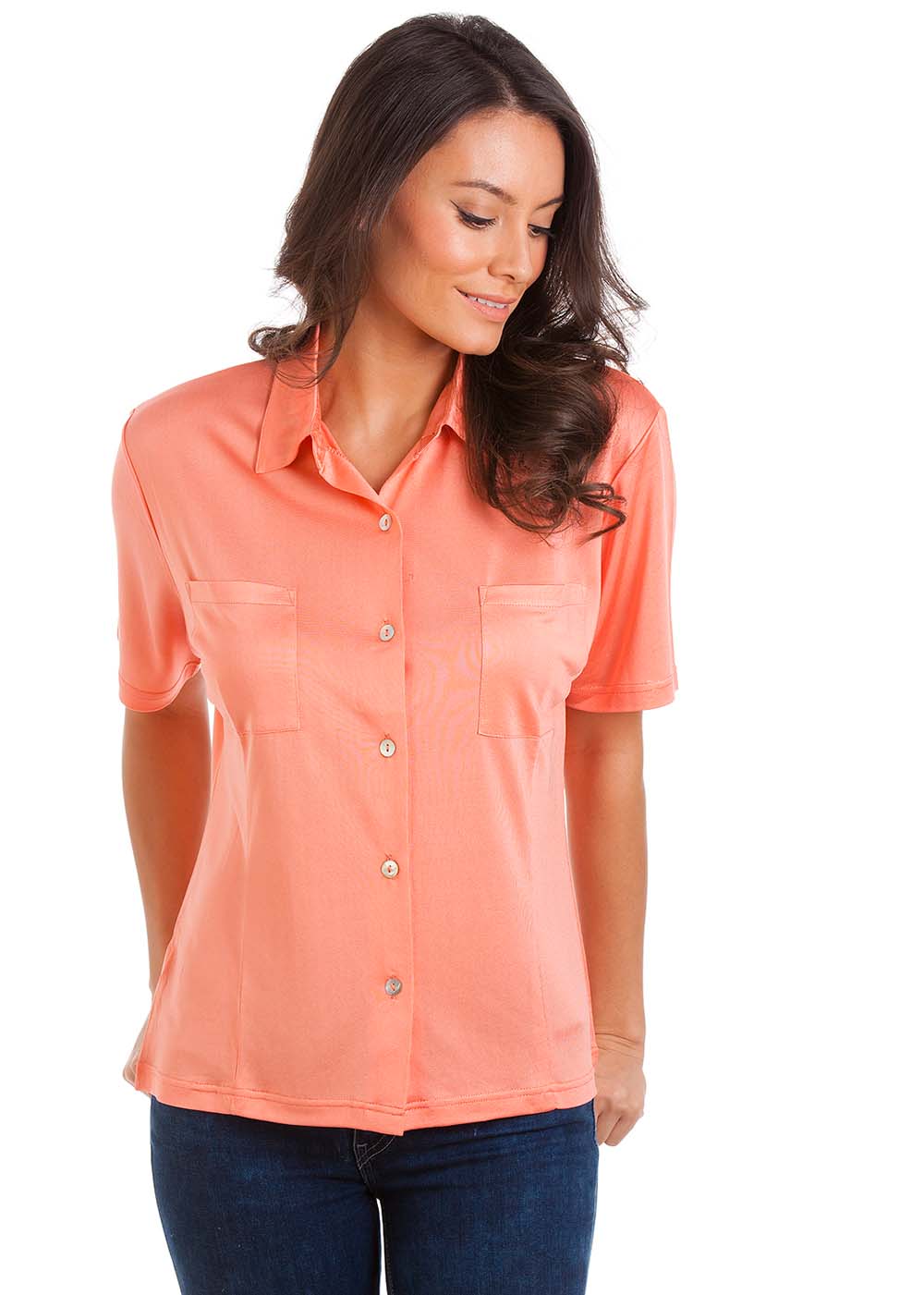 Short sleeved blouse in soft heavyweight silk jersey. This pure silk knitted fabric has a natural stretch and is a delight to wear. It has a neat revers collar, mother of pearl buttons and two breast pockets. Subtle darts at the front and back give an elegant shape. Length approximately 25"/63cm from top of collar.