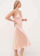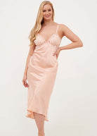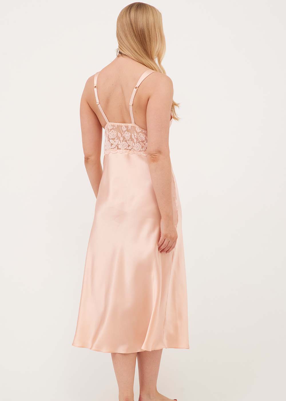 Luxurious nightdress in bias cut silk satin to give a beautiful moulding fit over the body. The shaped cups are silk lined for softness against the body and wide silk straps frame the decolletage extending to adjustable straps at the back. Length approximately 48”/122cm.